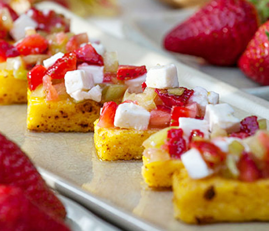 Poner sobre el salmón 4 frutillas en rodajas + 1/2 taza de choclo peruano + 2 o 3 palmitos en rodajas. Agregar Chimí churri y luego justo antes de servir, aliñar.